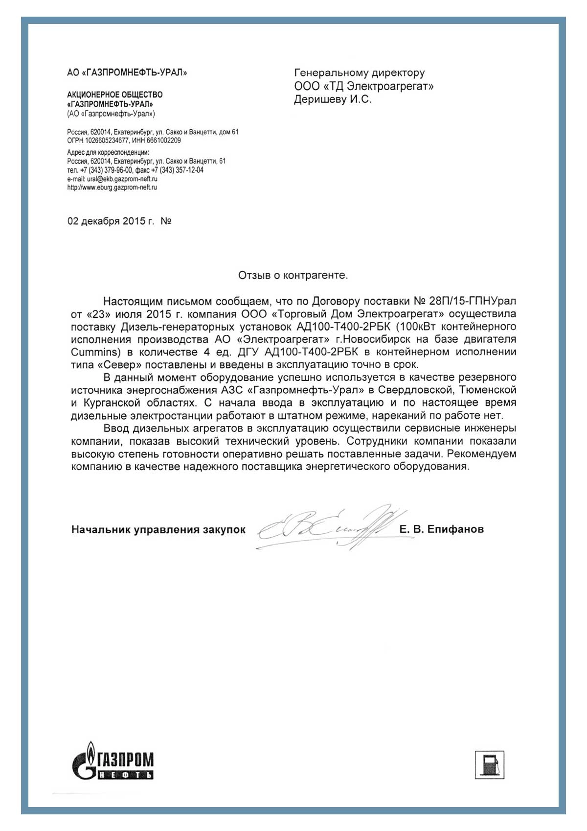 Настоящим письмом сообщаем, что по Договору поставки № 28П/15-ГПНУрал от «23» июля 2015 г. завод «Торговый Дом Электроагрегат» осуществила поставку Дизель-генераторных установокАД100-Т400-2РБК в количестве 4 ед. ДГУ АД100-Т400-2РБК в контейнерном исполнении типа «Север» поставлены и введены в эксплуатацию точно в срок.